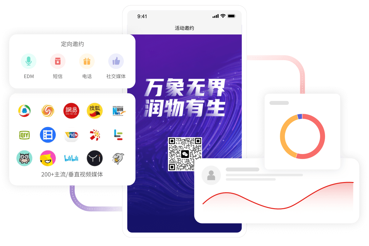 通过EDM、短信、电话以及社交媒体的精准邀约,结合主流媒体和垂直媒体的推广,实现广告的广泛覆盖和用户触达;采用邀约海报、大会官网、公众号、小程序、H5等多种形式的活动载体,提供活动预告、暖场视频、倒计时等丰富内容,优化用户在触达阶段的体验;同时,实施渠道溯源和效果看板,直观评估引流渠道的质量。